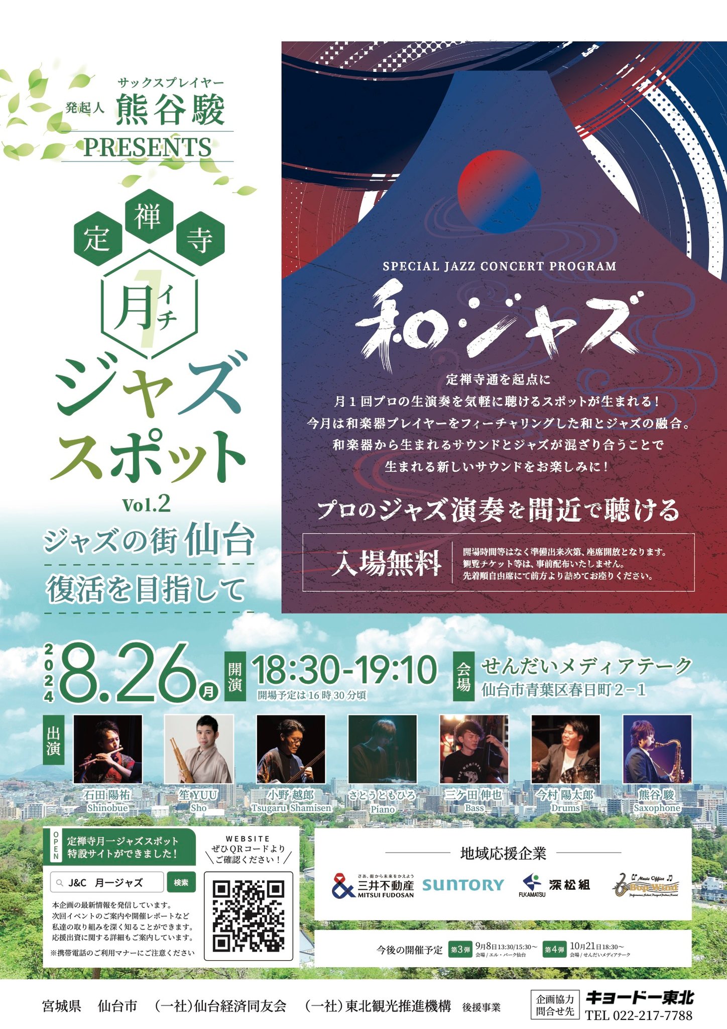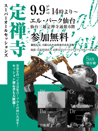 定禅寺ジャズフェス後援にて参加型ジャムセッション企画「定禅寺スーパーオールセッションズ」を開催しました。当日は、20名を超えるセッション参加者で会場は大盛り上がりにて終演しました。翌日は、当団体主催企画にて「熊谷駿スペシャルステージ」を開催し、2ステージ満席にて終演しました。