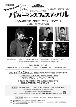 (公財)仙台市市民文化事業団主催 第3回パフォーマンスフェスティバルの特別企画として企画協力させていただきました。事前に寄せられたリクエスト楽曲により構成されたコンサートで子供の部、大人の部と開催しました。